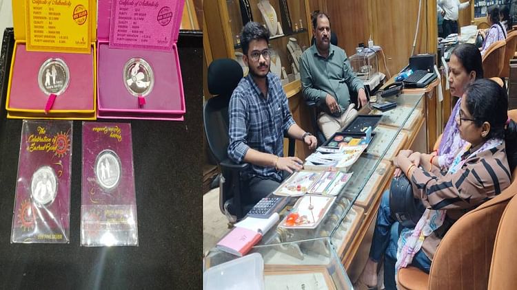 रक्षाबंधन पर बाजार में आए शगुन वाले सिक्के, सोने व चांदी की राखियां देखते हुए महिलाएं।