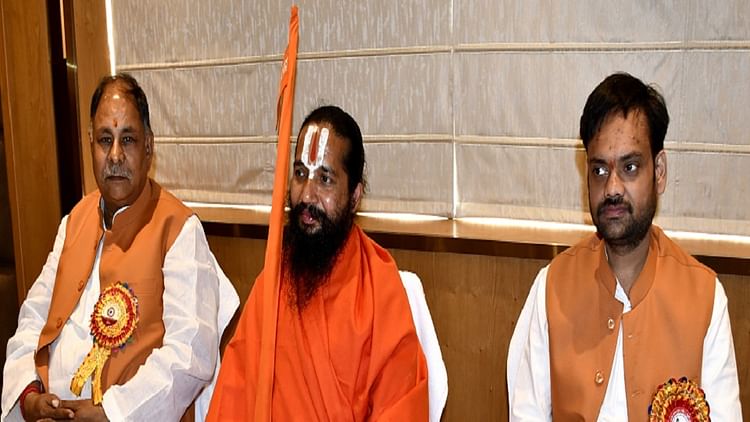 त्रकारों से वार्ता करते रामकृष्णाचार्य महाराज साथ में सतीश गौड, प्रवीन अग्रवाल