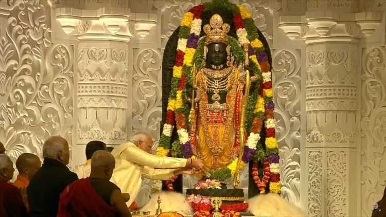 करीब आधे घंटे तक विधि विधान से पूजा होती रही। शंख के स्वरों के साथ संस्कृत के श्लोक गर्भगृह में गूंजते रहे। प्राण प्रतिष्ठा के बाद पीएम मोदी ने प्रभु रात की आरती उतारी।