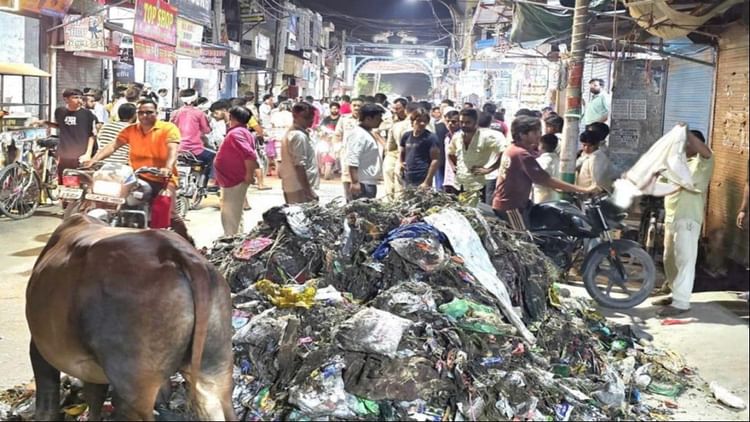 बाजार के बीच में कूड़ा डालकर हंगामा करने के लिए एकत्र हुए लोग।