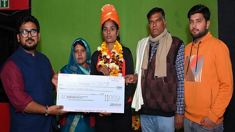 श्वेता को 11 हजार का चेक देते कटारा अकादमी निदेशक अतुल कटारा – फोटो : स्वयं