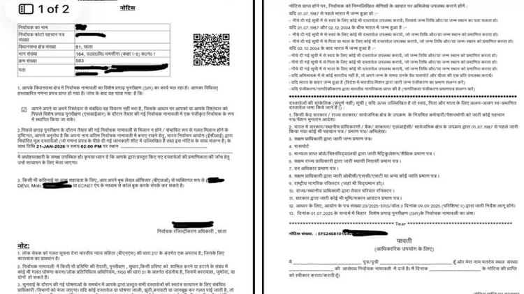 ड्राफ़्ट मतदाता सूची में शामिल ऐसे वोटर, जिनकी मैपिंग पिछली एसआईआर की वोटर लिस्ट से सही ढंग से नहीं हुई है, उनको नोटिस भेजा जा रहा है। ऐसे मतदाताओं को नोटिस प्राप्त होने शुरू हो गए हैं। चुनाव आयोग ने एक्स पर पोस्ट करते हुए नोटिस का सैंपल दिखाया है।