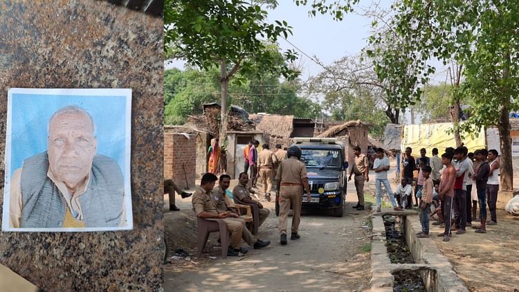 मृतक बुजुर्ग व गांव में मौजूद पुलिसकर्मी।