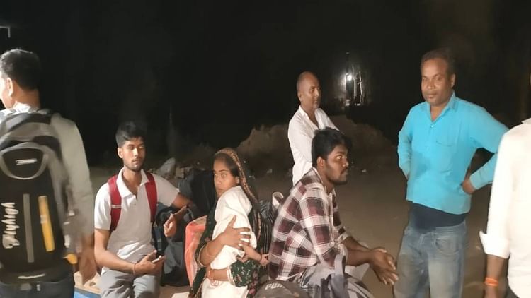 रात में बस से नीचे सड़क पर बैठे यात्री