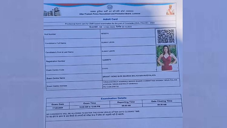 छात्र का दावा है कि उसने अपने आवेदन में सभी सूचनाएं व फोटो सही अपलोड कराईं थीं। जब प्रवेश पत्र निकाला तो उसमें सनी लियोनी की फोटो चस्पा निकली, जिससे वह भर्ती परीक्षा से वंचित रह गया। कन्नौज के तिर्वा स्थित सोनेश्री स्मारक महाविद्यालय में शनिवार को पुलिस भर्ती परीक्षा के दौरान उस समय खलबली मच गई जब एक परीक्षार्थी के प्रवेश पत्र में सनी लियोनी का नाम और फोटो चस्पा मिली। हालांकि, परीक्षा होने के बाद तक इस नाम का कोई भी अभ्यर्थी नहीं पहुंचा था। वहां के जिला प्रशासन ने मामले की सूचना उत्तर प्रदेश भर्ती एवं प्रोन्नति बोर्ड लखनऊ को दी।