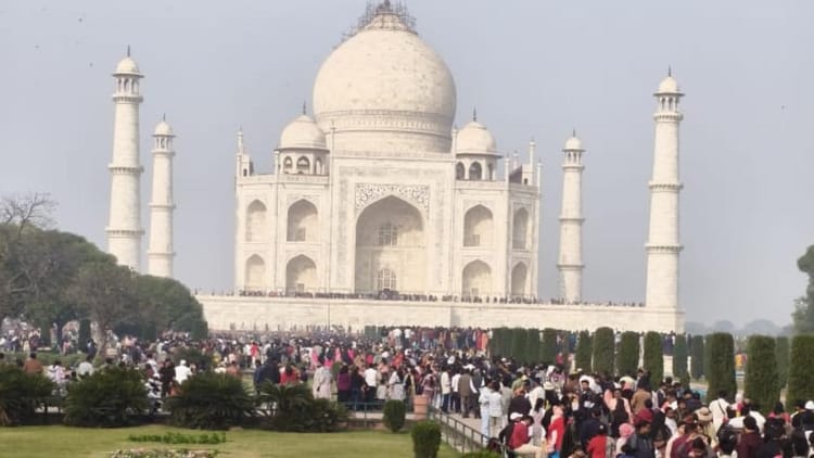 आगरा में शाहजहां-मुमताज की कब्र पर साल 2025 की समाप्ति से चार दिन पहले शनिवार को मोहब्बत की बेमिसाल निशानी देखने वालों का सैलाब उमड़ा। गुनगुनी धूप और गजब की भीड़ से होकर देखने हम भी गए। जगह-जगह गहरा पहरा। संग-ए-मरमर में समाए हुए ख़्वाबों की सेल्फी लेने की होड़ में क्या हिन्दू, क्या मुसलमान… क्या उत्तर क्या दक्षिण भारत… वैश्विक संगम के बीच अरब देश की दो युवतियां आपस में बात करती दिखीं, ‘यहां तो मुसलमान से ज्यादा हिंदू ताज का दीदार कर रहे हैं’। वहीं पूर्वोत्तर की एक युवती दूसरी से पूछ रही थी, ‘इसे क्यूं बनाया था’।