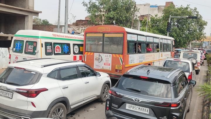मथुरा। नए बस स्टैंड से लेकर भूतेश्वर तक लगे जाम में फंसे वाहन और राहगीर।
