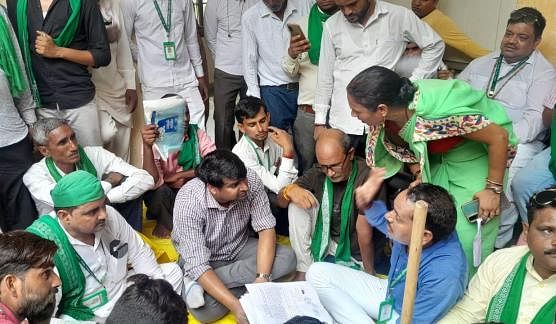 पटियाली में धरना दे रहे भाकियू स्वराज कार्यकर्ताओं से वार्ता करते एसडीएम ।