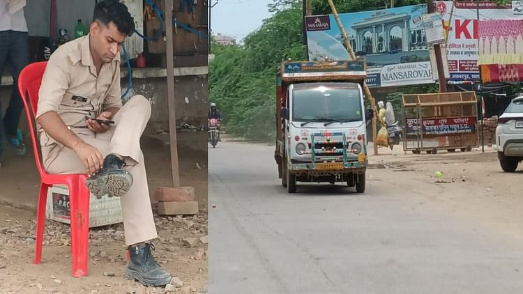 मोबाइल देखने में व्यस्त पुलिसकर्मी