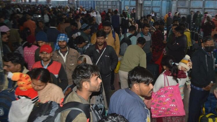 कोहरे में ट्रेने लेट होने पर आगरा कैंट रेलवे स्टेशन पर यात्रियों की भीड़