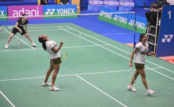 यूपी बैडमिंटन अकादमी में महिला युगल मुकाबले में अंक अर्जित करने के बाद उत्साहित त्रिशा और गायत
