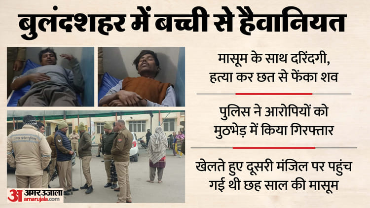 बुलंदशहर के सिकंदराबाद औद्योगिक क्षेत्र के गांव में छह साल की मासूम की सामूहिक दुष्कर्म के बाद हत्या कर दी गई। दरिंदों ने बच्ची के शव को छत से फेंक दिया। वारदात में शामिल दोनों आरोपी उसी घर की ऊपरी मंजिल पर रहते थे। पुलिस ने देर रात मुठभेड़ के बाद दोनों आरोपियों राजू और वीरू कश्यप को गिरफ्तार कर लिया।