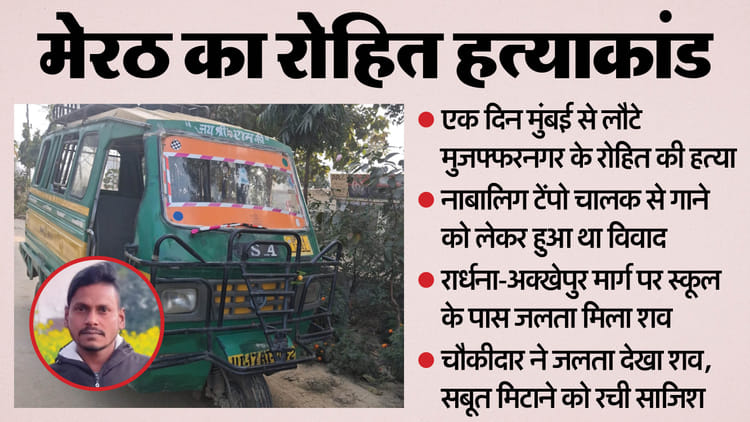 यूपी के मेरठ में टेंपो में गाना बजाने से मना करने पर टेंपो चालक और उसके साथियों ने मुजफ्फरनगर शहर के हनुमान चौक किला मोहल्ला निवासी रोहित उर्फ रोनू (28) पुत्र सुरेंद्र की हत्या कर दी। आरोपियों ने साक्ष्य मिटाने के इरादे से शव को रार्धना-अक्खेपुर मार्ग पर स्कूल के पास जला दिया। हालांकि शव पूरी तरह जल नहीं सका।