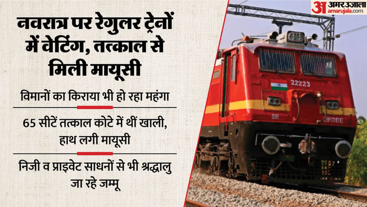 नवरात्र पर माता वैष्णो देवी दर्शन के लिए जम्मू जाने वाले श्रद्धालुओं को रेगुलर ट्रेनों से निराशा मिल रही है। ट्रेनों में वेटिंग से उनकी यात्रा अधर में लटक गई है। वहीं सोमवार को तत्काल कोटे की आस में बैठे यात्रियों को भी वेटिंग के ही टिकट हाथ लगे।
