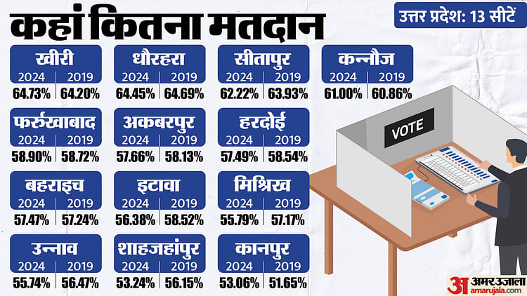 इसके अलावा सोमवार को हुए मतदान में खीरी, धौरहरा और सीतापुर के मतदाता अव्वल रहे। जबकि कानपुर फिर फिसड्डी साबित हुआ। खीरी में सबसे ज्यादा 64.73, धौरहरा में 64.45, सीतापुर में 62.22 और कन्नौज में 61 प्रतिशत मतदान हुआ। कानपुर में सबसे कम 53.06 फीसदी मतदान हुआ।