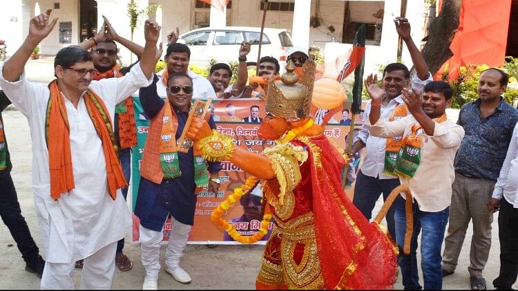 Prayagraj News: चुनाव परिणाम आने के बाद उत्साहित भाजपा कार्यकर्ता।