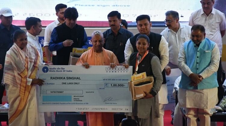 मुख्यमंत्री योगी ने बच्चों को नगद धनराशि देकर सम्मानित किया।