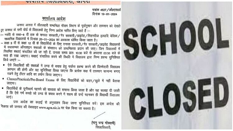 उत्तर प्रदेश के आगरा जिले में हाड़ कंपाने वाली सर्दी के रिकॉर्ड में बृहस्पतिवार का नाम दर्ज हो गया है। अधिकतम तापमान 11.2 डिग्री सेल्सियस रहा। यह 124 साल में दूसरा सबसे सर्द दिन रहा। न्यूनतम तापमान भी मात्र 7.6 डिग्री रहा। ऐसे मौसम में स्कूल के छात्रों को बड़ी राहत दी गई है। जिलाधिकारी भानूचंद्र गोस्वामी ने यूपी बोर्ड, सीबीएसई बोर्ड समेत अन्य बोर्ड के 8वीं कक्षा तक के विद्यालय 20 जनवरी तक बंद रखने के निर्देश दिए हैं।