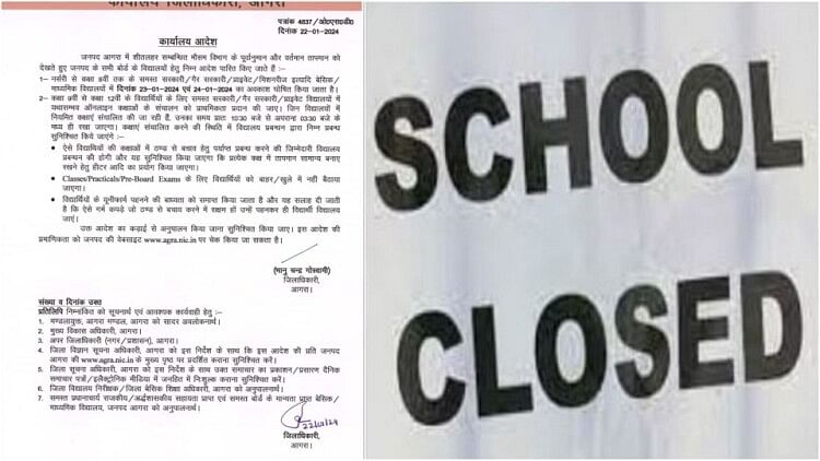 जनवरी की शुरुआत से ही आगरा भीषण ठंड की चपेट में है। भीषण ठंड को देखते हुए जिलाधिकारी भानुचंद्र गोस्वामी ने कक्षा 8वीं तक के विद्यालयों का अवकाश 24 जनवरी तक के लिए बढ़ा दिया है। अब विद्यार्थी 25 जनवरी को ही स्कूल जाएंगे। कक्षा 9 से 12 तक के विद्यालय पूर्वाह्न 10. 30 बजे से अपराह्न 3:30 बजे तक संचालित किए जाएंगे।