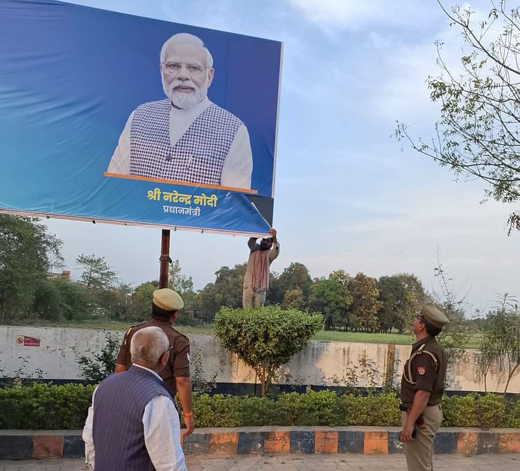 होर्डिंग को उतरवाते हुईं पुलिस