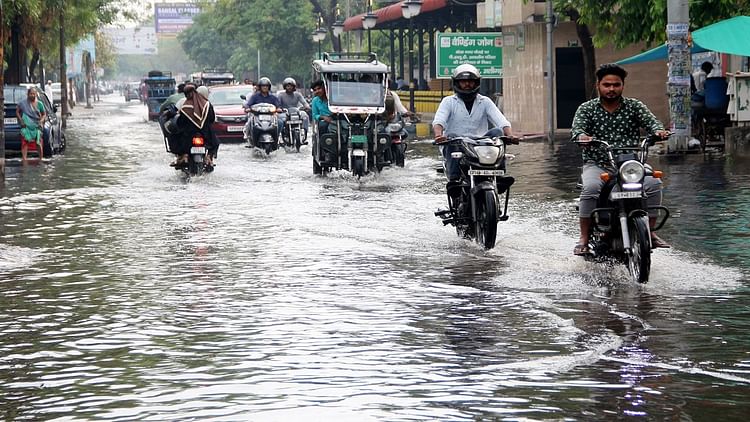 मैरिस रोड पर बारिश के बाद हुए जलभराव में होकर गुजरते वाहन सवार