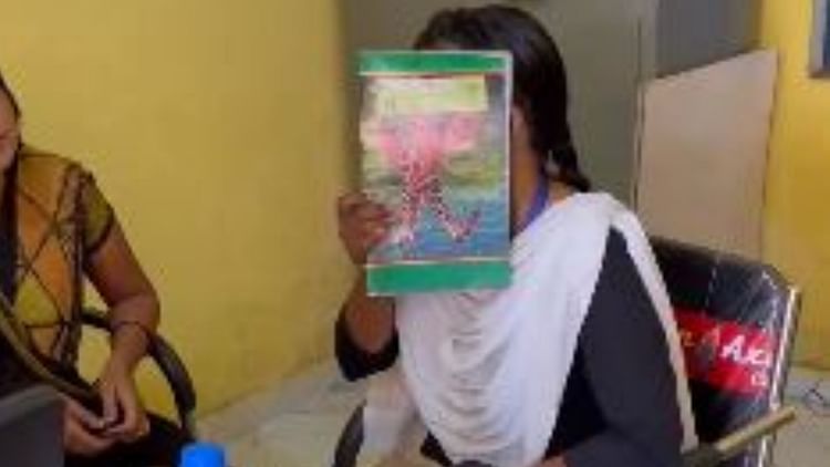 महिला ने कॉपी से चेहरा छिपाया