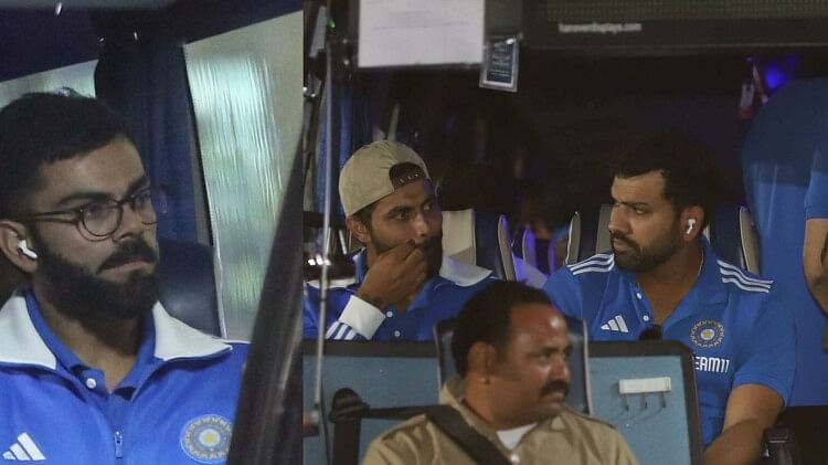 टीम बस में विराट कोहली, रवींद्र जडेजा और रोहित शर्मा।