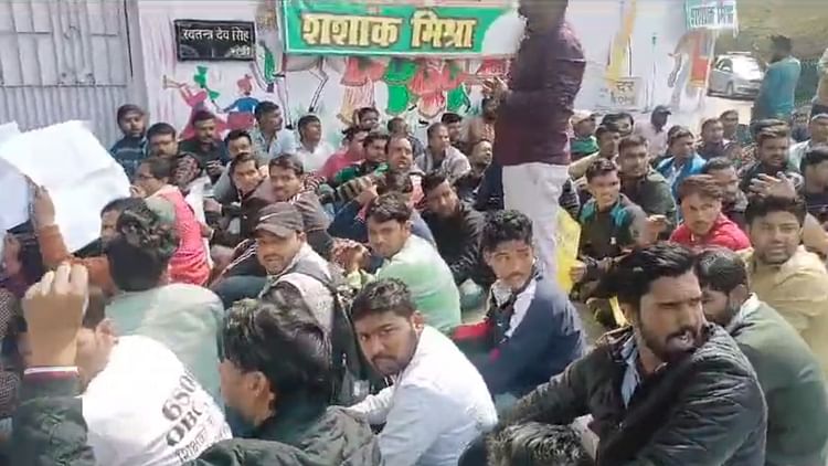 यूपी सरकार में मंत्री स्वतंत्र देव सिंह के घर के बाहर प्रदर्शन करते अभ्यर्थी।